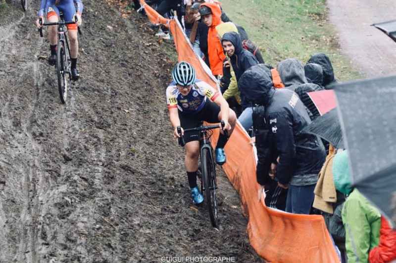 Lise KLAËS, cadette 1ère année, manifestement à l'aise sous la pluie et les terrains gras et glissants a très bien tiré son épingle du jeu. Partie en dernière ligne, elle va prendre un excellent départ pour se positionner aux alentours de la 25è place dans les premiers virages.